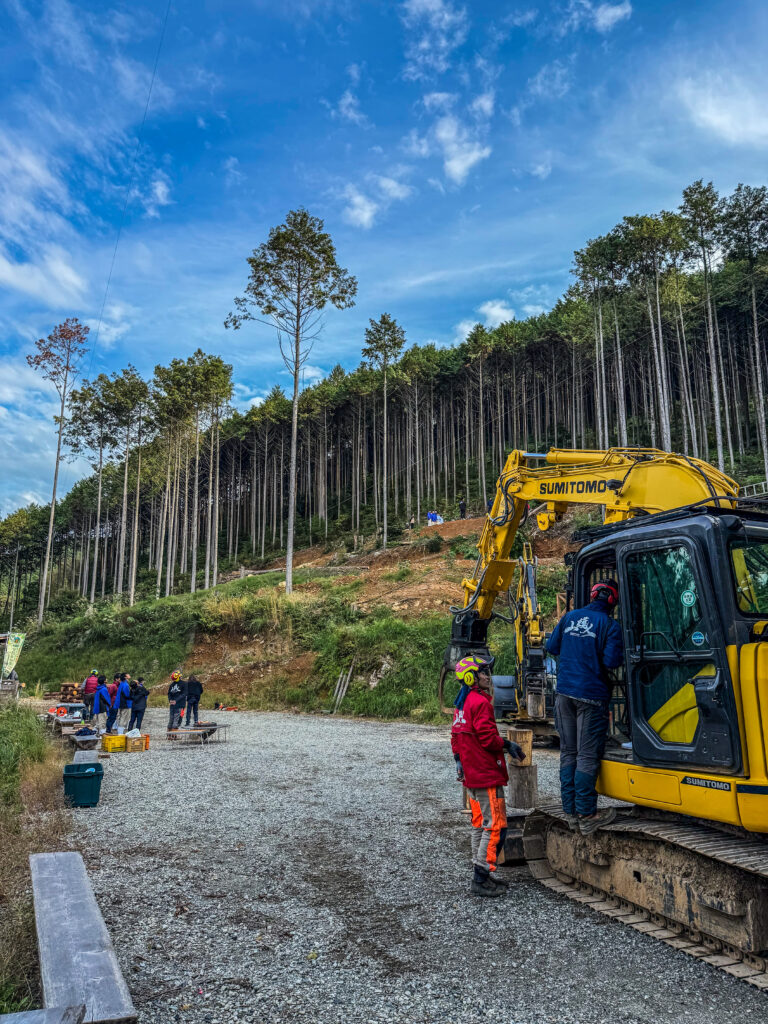 はじめに伐倒を見学したあと、重機操作、チェーンソー、ドローン体験