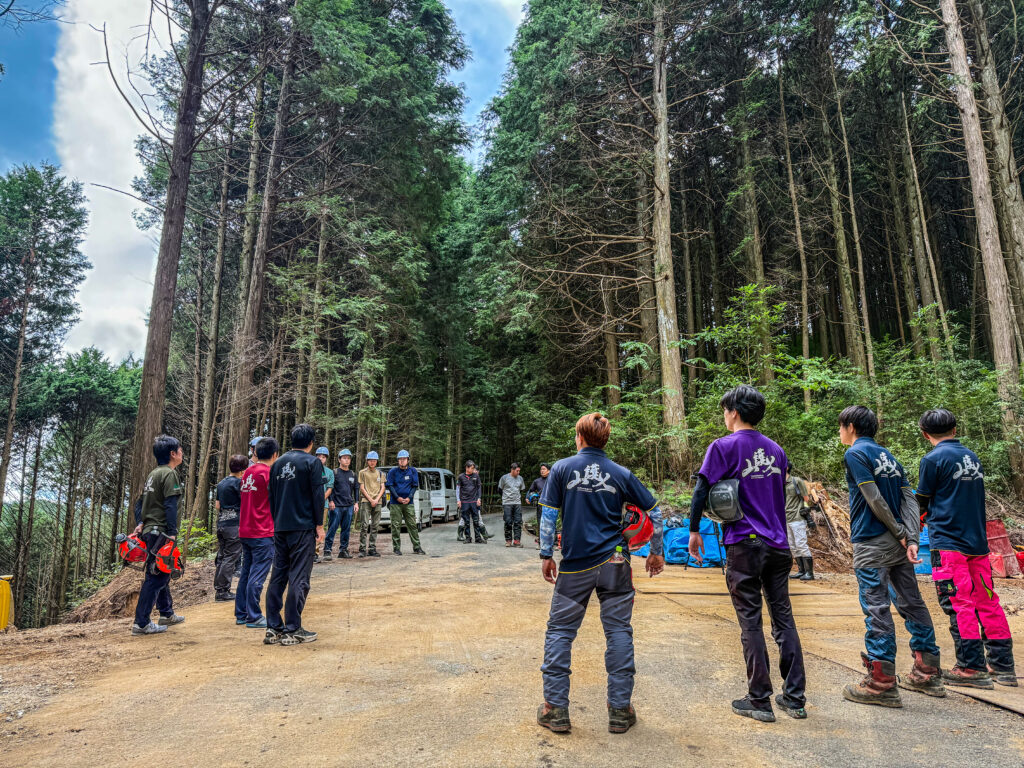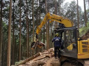 東京と愛媛の大学生が参加され、現場にて伐倒見学、重機体験をして